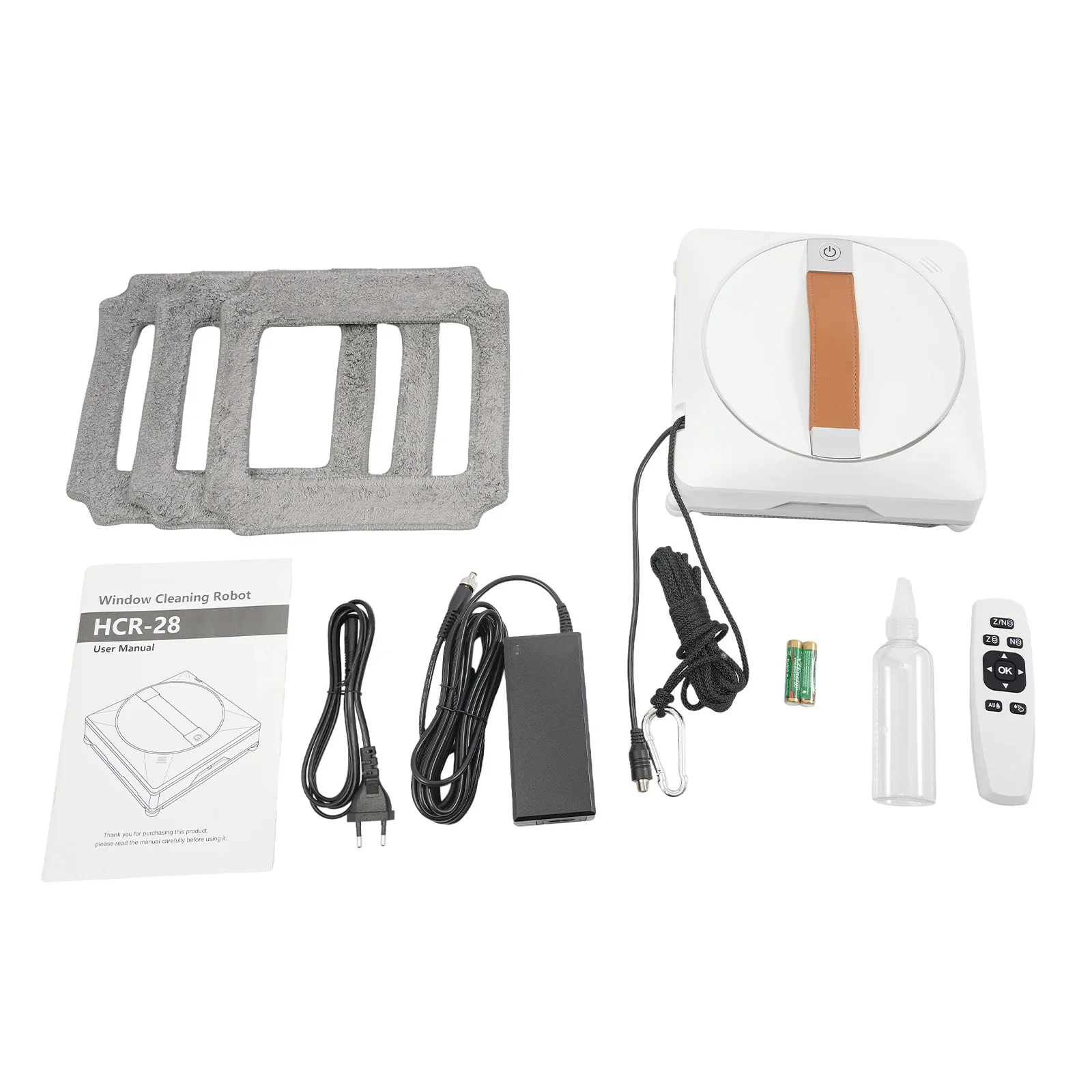 1* Window Cleaner4* Cleaning Cloths(One is Installed)1* Water Bottle1* Safety Rope1* Remote Control1* Power Adapter1* Power Cord1* English Manual
