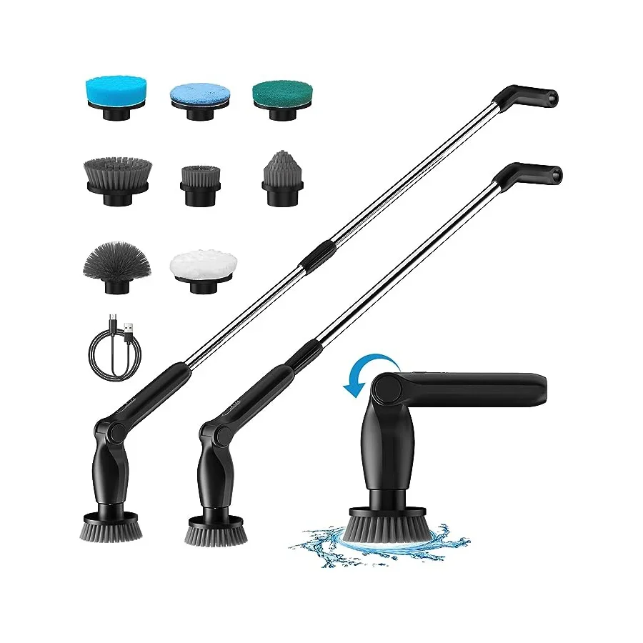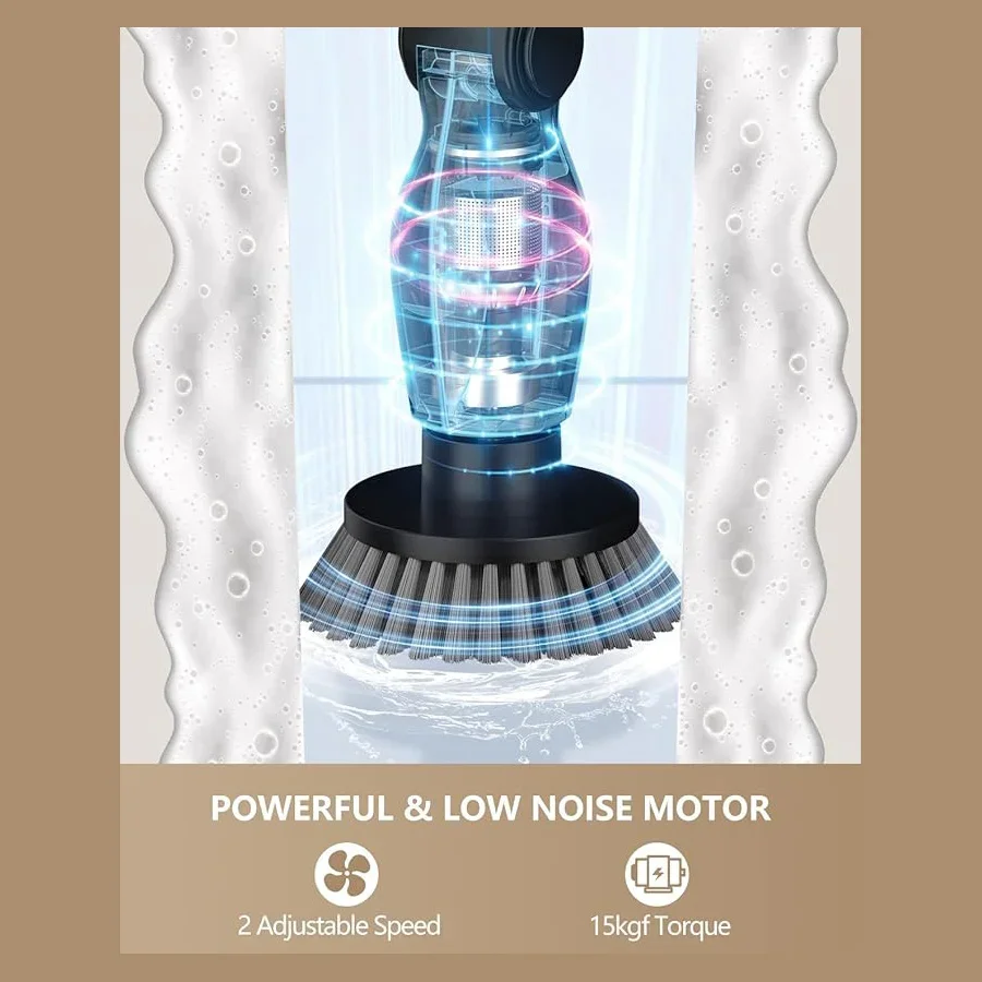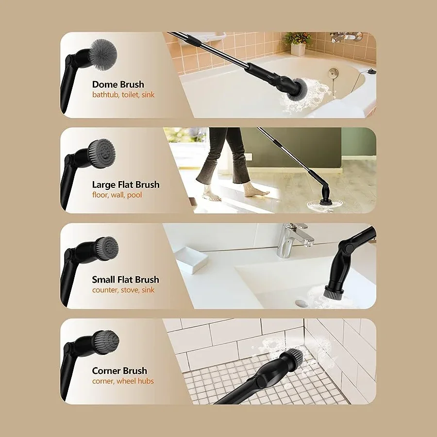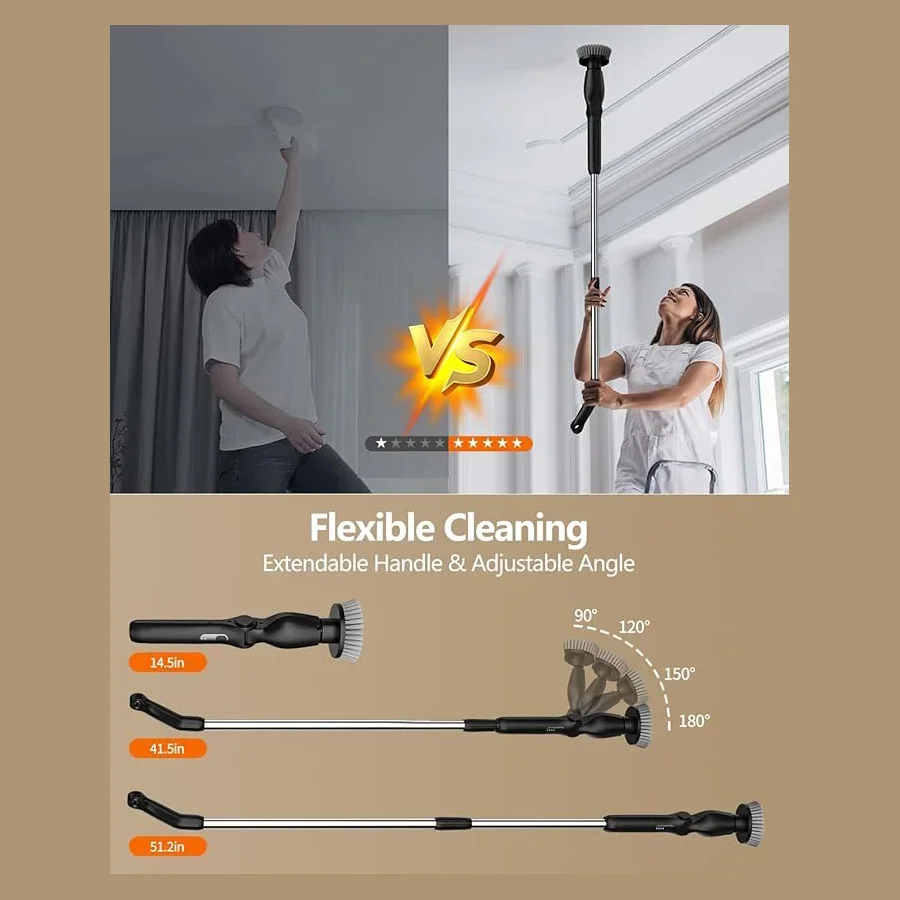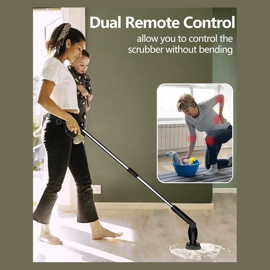 【High Torque & Low Noise Motor】Can help you remove stubborn dirt and stains effortlessly and efficiently. Up to 400RPM, 15kgf torque, and 55db low noise, scrubber features a high-performance motor for deep cleaning, which is much higher than the average of other shower cleaning brushes. There are two spin speed modes to meet your different cleaning needs. Now cleaning has become easy!【8 Replacement Brush Heads】8 replaceable cleaning brushes for various scenarios. Dome brush for the tub; Flat brush for surfaces like tile floor, wall, and pool; corner brush is great for cleaning grout, faucets, and edges; cloth brush for wooden floor and furniture cleaning; sponge is for the window. Moreover, you can even polish and wax your car with those heads.【Length and Angle Adjustable】electric scrubber can be adjusted from 14.5-51.2in, with 4 adjustable angles (90°, 120°,150, 180°). So you can use it to clean those hard-to-reach areas freely and easily without kneeling or bending over. No more back-breaking work and no single dirt left behind.【2 Ways to Control】Thanks to the extra remote controller on the long handle, you can now adjust the speed or turn the machine on/off without bending or kneeling. it’s a small change to save your knees and back. Besides, you can also control the machine with the controller on the short handle. Notice: the machine requires a long pressing to turn on.【One Charge to Clean the Whole House】Adapted upgraded 2000mAh*2 battery and USB-C fast charge tech, electric bathtub scrubber fully charges in 2.5 hours which lasts 60-90 min, far enough to clean your entire house. You can check the remaining battery by the LED light on the machine.