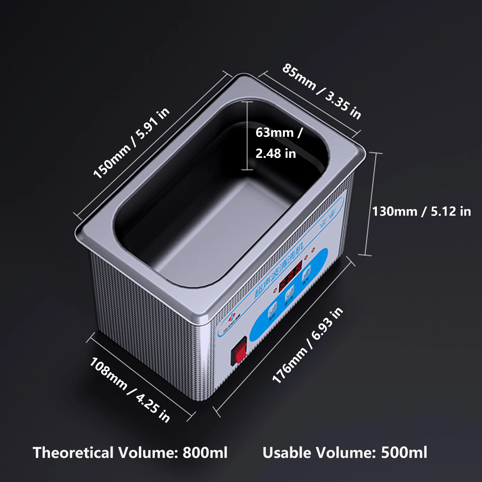Warm Reminder1. Please do not run the machine continuously for more than 30 minutes.2. Our products come with 1-year maintenance service, please feel free to contact us if you have after-sales problem.3. Please select the correct voltage and plug.4. Please keep your pets away while the machine is working.The ultrasonic cleaner machine use ultra high frequency vibration to achieve deep cleaning effect, so working noise is unavoidable.This might be unbearable for pets and some people.Item: 800ml Portable Ultrasound Bath Cleaning Machine With Basket for Jewelry Glasses Small Things etcKey Features:1. Compact size 800ml ultrasonic jewelry cleaner machine for home use or carrying out.It can contain small items which are are smaller than 5.8 × 3.2 × 2.4 inches.With this, you can do a professional ultrasonic cleaning job at home or at a wedding.2. The ultrasonic cleaning tub is made of stainless steel, which is more sturdy than plastic machine, has a long service life. SUS304 stainless steel tank can resistant to weak acids and alkalis.3. This mini ultrasonic cleaner can widely used for cleaning small objects such as gold / silver jewelry, watch parts, ring, coin, glasses (smaller than 5.9 inches), fountain pen parts, 3D printed parts, bike chains, small tools etc.4. Ultrasonic cleanser does a fast, effective and pratical cleaning job.40kHz high frequency vibration can effectively penetrate tiny crevices and blind holes, thoroughly clean objects with complex construction or irregular shapes.5. The ultrasonic washing machine is easy to use, comes with 18 time settings (90 s~30 mins) to meet your different cleaning needs. With just water and cleaning solution, the jewelry cleaner machine will give you a sparkling item like brand new. Also come with degas function, which can remove air bubbles generated during working so as to achieve a better cleaning effect.6. The ultrasonic bath come with a metal basket, can protect your small stuffs from scratches, is convenient to remove the cleaned item from the bath. (not a must to use)Stronger Power VersionsSpecificationsMain Material: stainless steelInput: AC 100V-120V or 220-240VUltrasonic Frequency: 40kHzUltrasonic Power: 35WFull Tub Capacity: 0.8LEffective Capacity: approx 0.5L /16.9 fl ozBathtub Dimensions: 5.9 × 3.3 × 2.48 inches (L× W× D)Basket Dimensions: 5.9 × 3.3 × 2.48 inches (L× W× D)Operation: digital control panelWorking Time: 90 seconds-30 minutesHeating Function: noNote:1. There's no heating function for this small device, so it can not heat to dewax and degrease. But you can fill with warm water ( about 40-60℃)to achieve a better cleaning effect.2. This sonic jewelry cleaner machine is not suitable for soft stones like pearl. For expensive jewelry, please consult your local jewelry store for professional advice before cleaning.Package Includes:1 x Ultrasonic Cleaner1 x Stainless Steel Lid1 x Metal Net Basket1 x Power Cord1 x User Manual