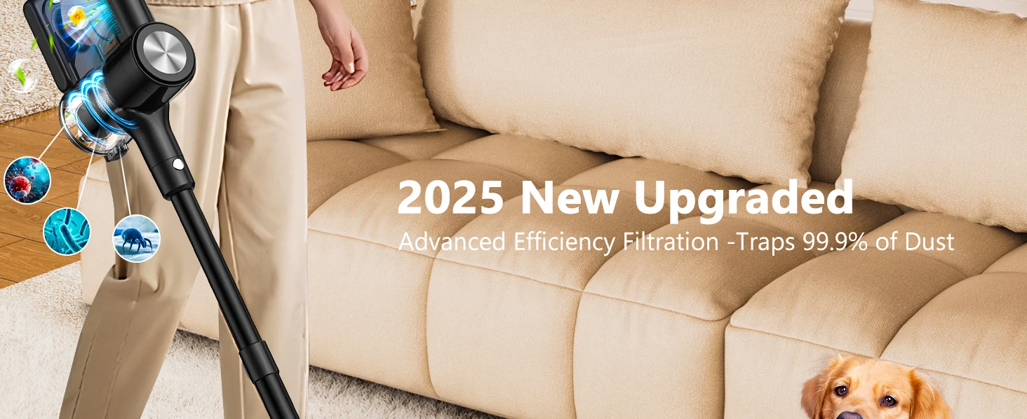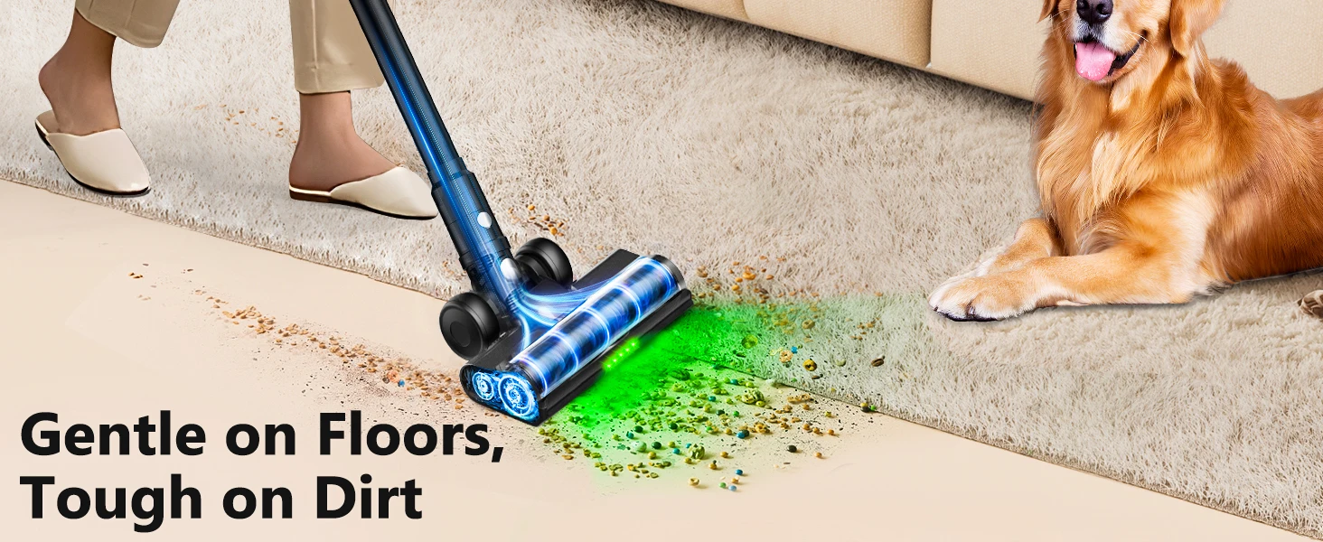 500W/55KPA Super Strong Suction: The cordless vacuum cleaner powered up to date a 500W motor that generates 55KPA suction power, 40% stronger than most cordless vacuums, enough to deeply vacuum debris from carpets and hard floors, and easily handle your furry friends' hair, spilled chips, and fine dust from floor gaps, toddler snacks.Self-standing Feature: No nails, no drilling! This stick vacuum cleaner can stand upright independently to avoid damaging your wall. At the same time, The on its own design, allowing you to pause cleaning anytime without leaning against walls. You no longer have to find a spot to prop the vacuum up or worry about it falling over! And it fits effortlessly in corners, or behind doors, freeing up your space!55 Min Runtime & Wall Mount Charging : The 2025 Upgrade 2500mAh lithium-ion battery provides 55 minutes of running time for this vacuum cleaner enough for a 2,500 sq.ft home. The battery fully recharges in 4 hours. The vacuum cleaners for home has a rechargeable wall-mounted bracket for plug-and-play convenience, you can place the vacuum into the wall-mounted charging dock to charge. No more worries about losing.3 Suction Modes & Smart Display: You can switch easily between MIN, MID, and MAX modes with a single button to adapt to different floor types and messes. Through real-time monitoring of the vacuum cleaner's screen in real time to understand the vacuum battery power, suction mode and fault alarm. The simple operation can be easily used even by elderly people living alone.Pet Hair Annihilator: Newly upgraded V-shaped Brushroll of the pet vacuum shreds golden retriever fur, long hair, and lint—guiding strands into suction inlet instead of wrapping. 5 large bright LED floor lights can illuminate the corners and hidden dust and hair has no place to escape for a more comprehensive cleaning.6-Layer Filtration System: Compared with the traditional white HEPA, the upgraded blue HEPA has higher accuracy, which can effectively capture 99.99% of large particles and fine dust and protect your vacuum motor, extending its service life.1.5L dust storage capacity, so you don’t need to empty it frequently, making the cleaning process smoother and more efficient.Lightweight & Multi-Functional Attachments: Lightweight and portable, this vacuum cordless can be quickly converted to a handheld vacuum and lifted with one hand for quick cleaning around the house. The 2 in 1 brush targets narrow spaces and corners, while the sofa brush lifts embedded pet hair and stubborn debris from sofas, beds, and mattresses for a deeper clean where it matters most.Worry-Free After Sales: Each SuXiangVac cordless vacuum cleaner comes with 24-month protection plan and 24/7 customer service. If you encounter any problems, please contact us via message or email.