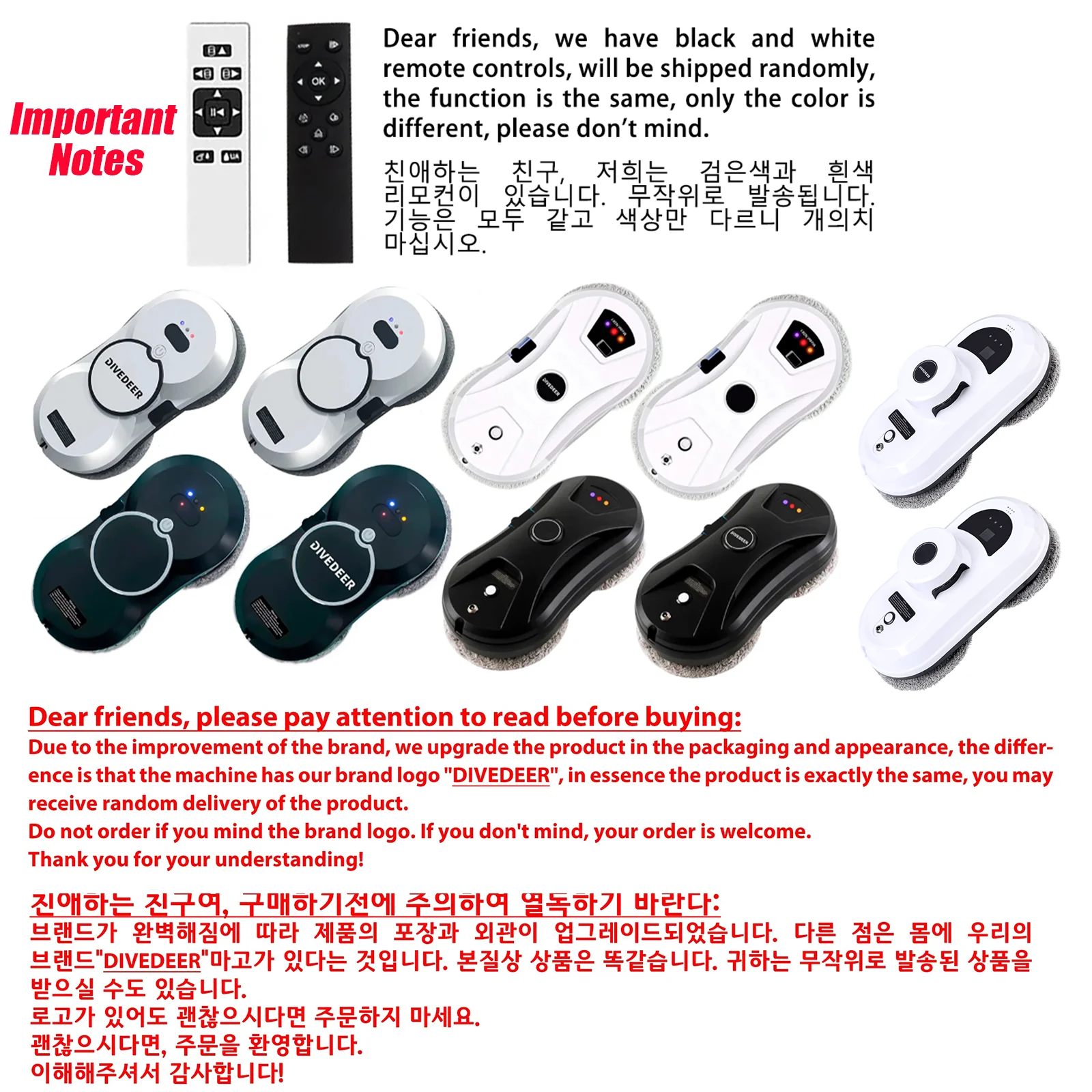 Hey! Friend Please note that you should double check the model number you want to buy before placing an order. When placing your order, please check the model number you need so that you don’t buy the wrong model and get a return or refund. (Note, 1. We have a total of two styles of window cleaners, the first model is printed with the “DIVEDEER” brand logo, and the second model is not printed with this logo. Both models will be shipped randomly.2.We have two colors for the product remote control, the first one is white and the second one is black, both colors will be shipped randomly.3.The sku inside the link that says 5600pa is for two wheels, one wheel is 2800pa.)Any questions please contact, monajie@qq.com, I will reply you within 48 hours!Hi Dear buyers.1. This product must be connected to the power cord to use, not WIFI style.2. The remote control will not light up, put 1 pair of batteries into it, you can use it, (batteries are not included in the product, you need to buy them separately)3. The machine has two modes, the first is the automatic mode, the second is the manual mode (After the machine lights up, it is useless to use the remote control, this is the automatic cleaning mode, if you don’t want the automatic mode, you need to turn off the machine and wait for 1-2 minutes to restart the machine, turn on the machine and long-press it for 20 seconds, then it will enter into the manual mode, then you can use the remote control)————————————————————————————————————————————————————————————————————-The whole machine has passed CE, FCC, ROHS quality testing and certification;The power supply passes the CCC, CE, FCC, UL, ROHS safety testing and certification;Packing list:1 main unit1 power cord + adapter,1 remote control2 pairs of cleaning rings (4 pcs)1 4-meter extension cable1 spray bottle10 cleaning cloths (YTK-330 has 12 cleaning cloths)1 product manual (in English)Using way:1. Wait 20 seconds after starting up until the blue light stop flashing,Then start working. Because the robot need 20sec to detect the glass plane.2. Binding the safety rope when using, Prevent falling from high altitude.3. Spray some water on the edge of the Mop when working, will be better effect.4. When you receive the item, please contact us if you have any questions, we will solve it for you.(When you don’t know how to use it, I will give you answer and send you an operation video)