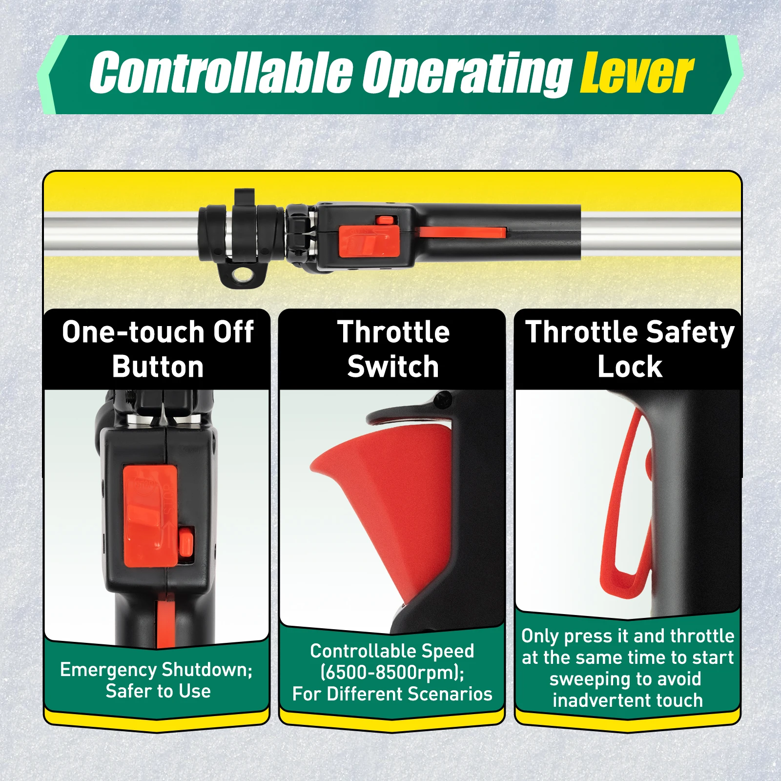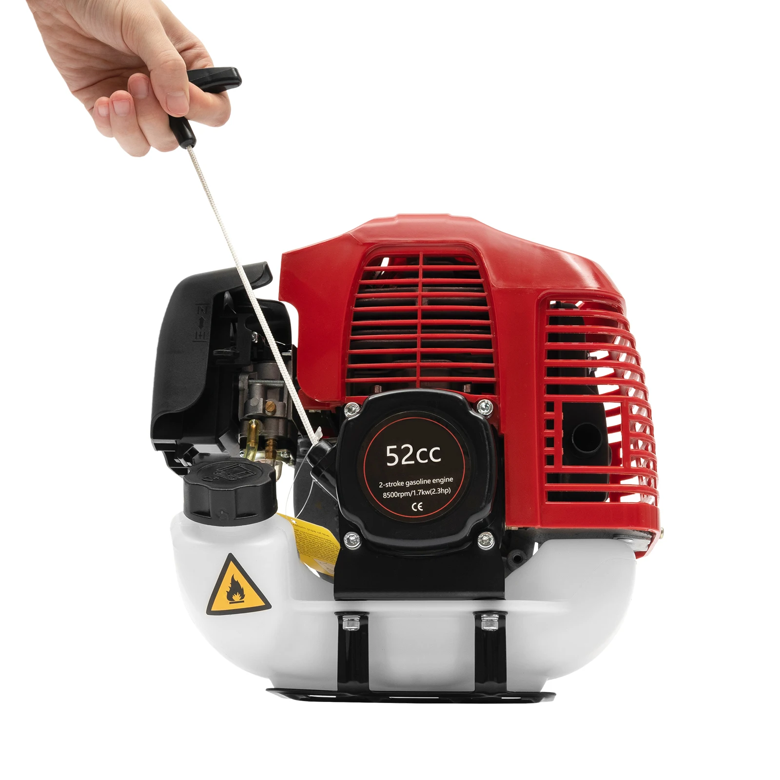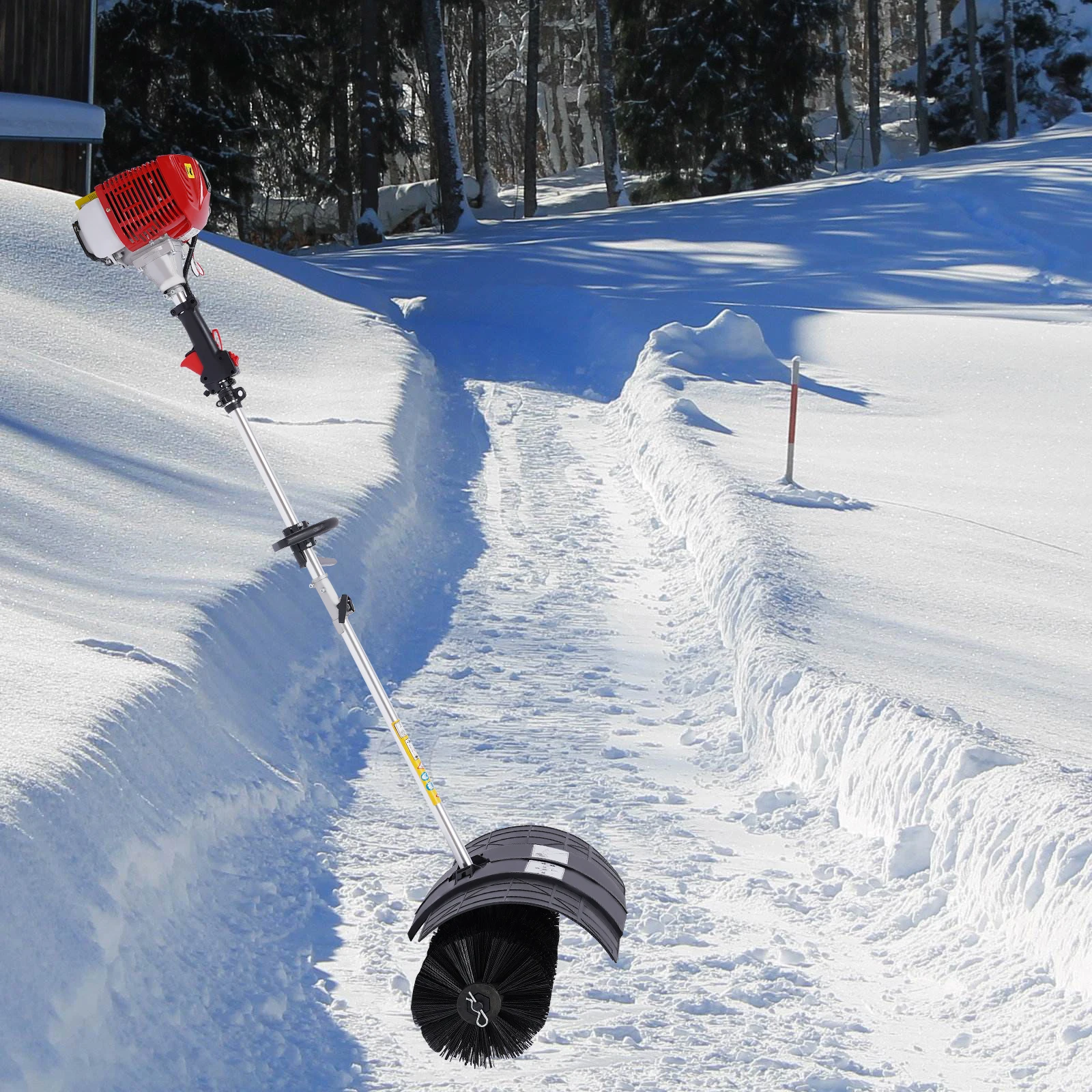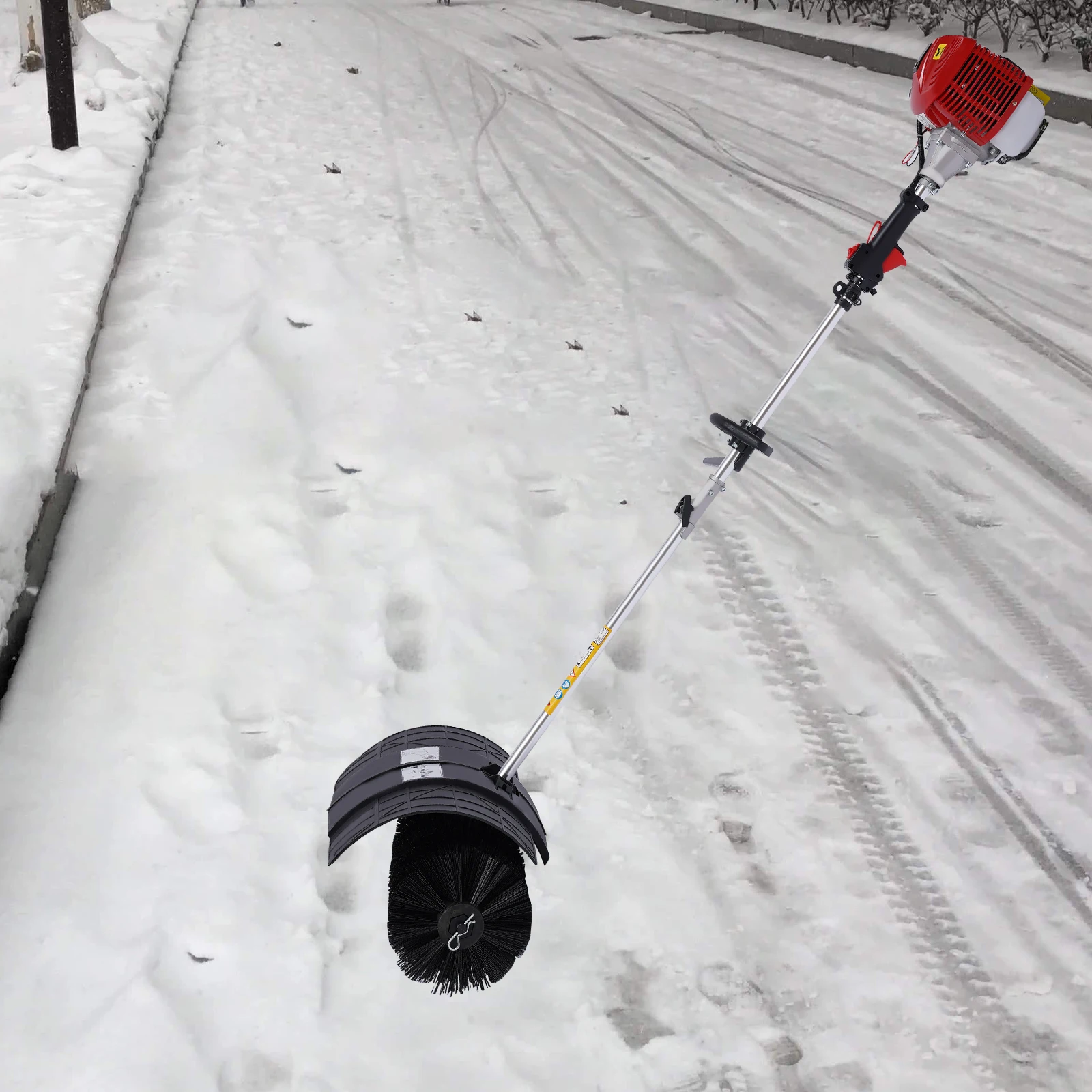 Handheld Power Broom with Powerful Fuel Engine 52CC 2 Stroke Side-Mount Sweeper Snow Sweeping Broom Artificial Grass Power BrushThe traditional way of sweeping the floor with a broom is time-consuming, labor-intensive, and prone to backache at the end of the process. Advancement in technology has brought about labor-saving and professional sweeping equipment which is ready to liberate you from the hassle of manual sweeping. This handheld power broom with a powerful fuel engine sweeps more efficiently than a manual sweeper, saving valuable time and making sweeping a pleasure.Key FeaturesProfessional Cleaning Ability: Thanks to the robust dense nylon brush head that doesn’t shed and doesn’t damage floors easily, the sweeper not only removes dirt and leaves effortlessly, but also reliably clears snow and grit from driveways and sidewalks in winter. High-quality Material: The aluminum rod is lightweight, rustproof, corrosion-resistant, and drop-resistant. PP engine shell is high temperature resistant and shockproof to provide better protection for internal parts.Great Power: With its two-stroke fuel engine, this sweeper has a powerful horsepower(1.25 kw) which allows it to clean large areas quickly and efficiently to save more valuable time and make sweeping an enjoyable experience.Large Cleaning Area: This large brush head of 9.4*20inchallows you to clean large areas over the same period compared to a normal broom. User-friendly Design: The large fuel tank, which holds 0.26 gallons of fuel, provides great convenience for extended use without frequent refueling. Only press the throttle safety lock and throttle at the same time to start sweeping to avoid inadvertent touch and ensure the safety of use.Easy&Comfortable to Operate: The one-touch off button and manual starter (pull 3-5 times) make it simple to use, so even novices can master it quickly. The strap brings weight sharing from the arm to the shoulder, relieving arm fatigue. Its enlarged padding also reduces the pressure on your shoulder.Good Heat Dissipation: The heat dissipation holes on the engine can effectively dissipate heat to ensure stable operation, reduce noise, and prolong the service life of the machine.Adjustable Speed: The speed can be regulated (6500-8500rpm) by controlling the throttle so that you can select different speeds for different scenarios to achieve a higher cleaning efficiency.Easy to Carry: Lightweight (22.8lbs), detachable structure and shoulder strap make this sweeper easy to carry to clean your garden with ease.DetailsErgonomic Handle: The ergonomic curved handle in the middle of the rod allows you to better maneuver the broom, well reducing the difficulty of cleaning tasks.Curved Baffle: It prevents the operator from being harmed by sand, small stones, grass, branches, etc., that are raised during work to play a protective role.Damper Slider: The damper sliders on the engine ensure your engine running performance by closing the dampers upward before a cool start and opening them downward after a start.Air Filter: It has a good impurity filtration effect, which greatly reduces power loss and prolongs the life of the engine.Exhaust Hole: A small exhaust hole on the side of the motor helps reduce noise, protects hearing and creates a comfortable working environment.ApplicationIt is ideal for grooming lawns on farms, streets, parks, or homes. It can also be used to clean dirt, leaves, snow, moss and debris from different surfaces such as tile, marble, concrete, rubberized tracks, and oiled roads.SpecificationEngine Casing Material: PPRod Material: AluminumBrush Material: NylonBrush Head Type: Rolling Bar BrushAssembly Required: YesStarting Method: Hand Pull StartDrive Type: Petrol-powered Automatic ClutchEngine Type: 2-stroke Air-cooled Fuel EngineEngine Idle Speed: 2800-3400rpmWorking Speed: 6500-8500rpmGearbox Reduction Ratio: About 46:1Engine Power: 1.25kwDisplacement: 52ccFuel: Gasoline-oil Mixture (25: 1)Tank Capacity: 1L/0.26galTotal Length: 189cm/74.4inchMotor Size: 25*14.5*25.5cm/9.8*5.7*10inchRod Length: 135cm/53inchBrush Head Size: 24*51cm/9.4*20inchCurved Baffle Size: 60.5*33cm/23.8*13inchPackage Size: 107*40.5*30cm/42*16*11.8inchGross Weight: 15.25kg/33.6lbsNet Weight: 10.35kg/22.8lbsPackage Included1 * Main Machine (with Engine and Rod)1 * Connection Rod1 * Brush Head1 * Protective Glasses1 * Curved Baffle1 * Shoulder Strap1 * Funnel1 * Fuel Oil Mixing Bottle1 * English ManualOther Accessories for AssemblyNotes1. Please carefully read the manual and strictly follow the precautions to have a better experience.2. Please note that a two-stroke engine requires a fuel mixture (gasoline:oil/25:1). If only gasoline is added, engine damage may result.3. Please allow the slight color difference caused by the shooting light and 1-3cm error due to manual measurement, and make sure you do not mind before ordering.