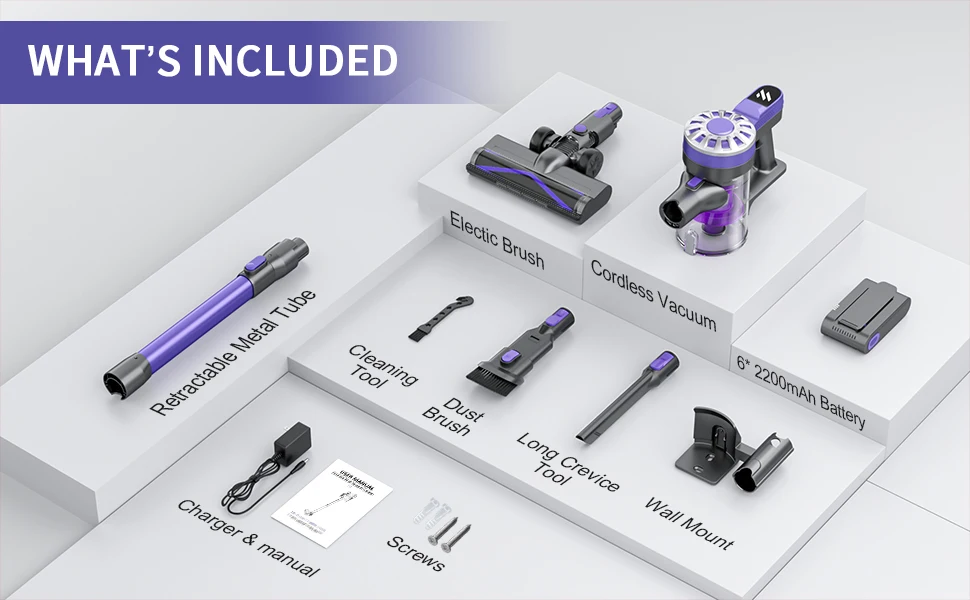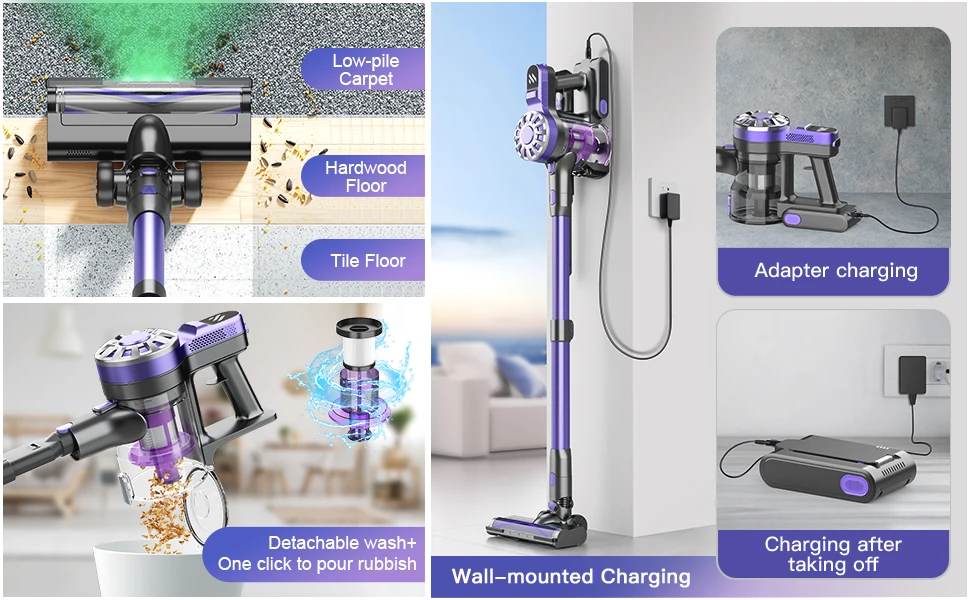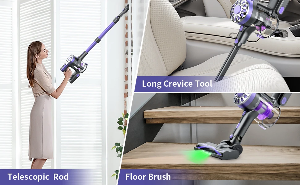 Description【38Kpa Powerful Suction Vacuum】With newly upgraded brushless motor and advanced floor brushes, this cordless stick vacuum cleaner can provide 38Kpa strong suction power. Powerful stick cordless vacuum can efficiently handle pet hair, dust, and fine particles on the carpet. Cordless vacuum is very suitable for quickly cleaning the whole house before guests arrive.【Detachable 2200mAh Battery】Powered by a lithium-ion battery, the cordless vacuum cleaner runs up to 40 minutes in eco mode, and 20 minutes in high mode. lightweight cordless vacuum easy to switch between modes and start.【Enhanced Visibility】The 3 LED headlights of Stick Cordless Vacuum Cleaner can illuminate furniture in dark corners, ensuring thorough cleaning. Its 180° swivel capability from side to side and 90° range of motion up and down make cleaning every nook and cranny a breeze, leaving no space for dust and grime to hide.【Advanced Filtration System】Utilizing a 5-stage advanced fully-sealed filtration system, this cordless stick vacuum cleaner effectively captures 99.9% of tiny dust particles as small as 0.1 microns. It locks in small particles without leakage, preventing secondary pollution. Additionally, powerful cordless vacuum fresh air system with air outlet design delivers purified air for your family.【Ergonomic Design】Designed for ease of use, this vacuum cleaner boasts a lightweight body, allowing for effortless one-handed operation. It’s an ideal choice for individuals with limited strength, including the elderly, women, and teenagers. Perfect for daily cleaning tasks in homes, dorms, and apartments.