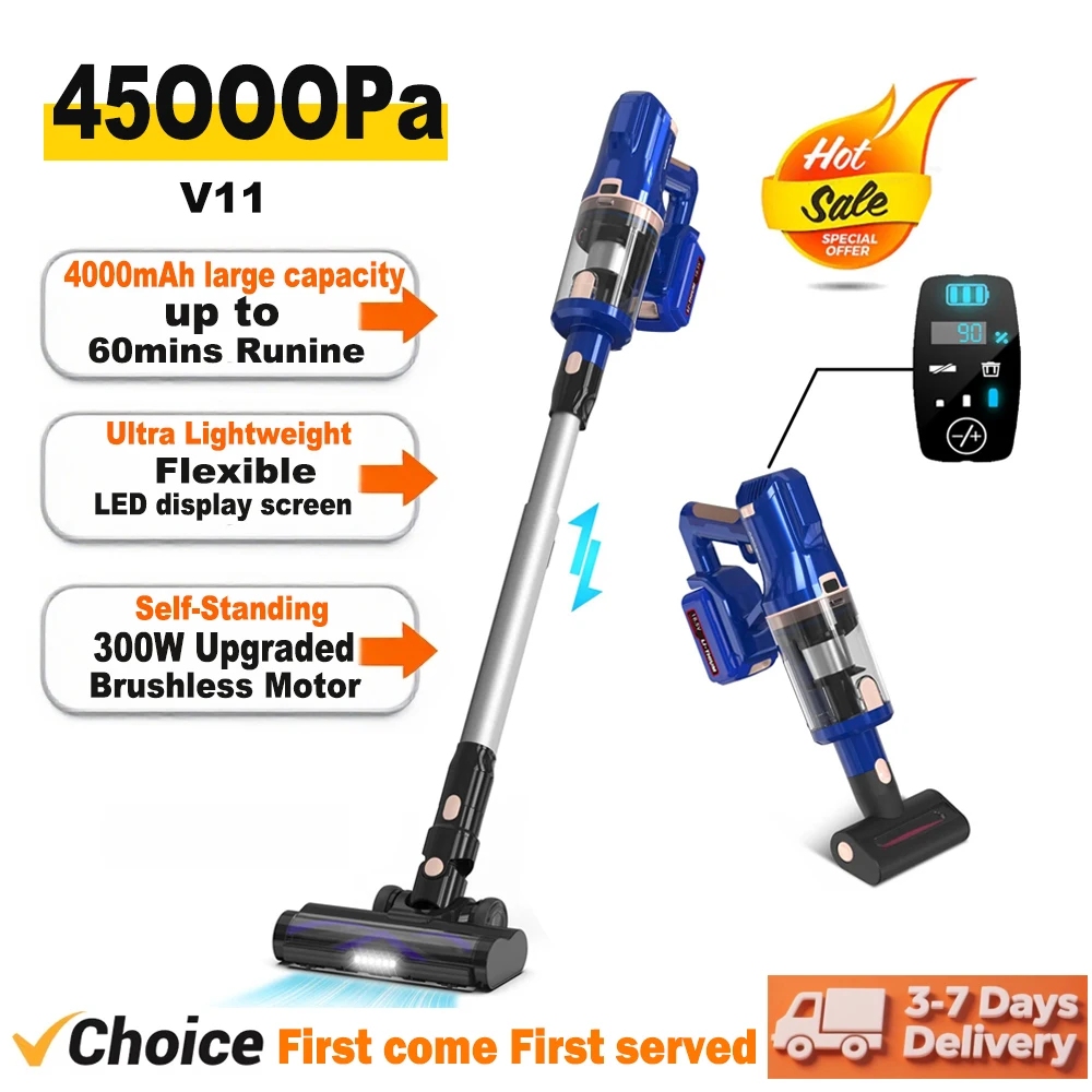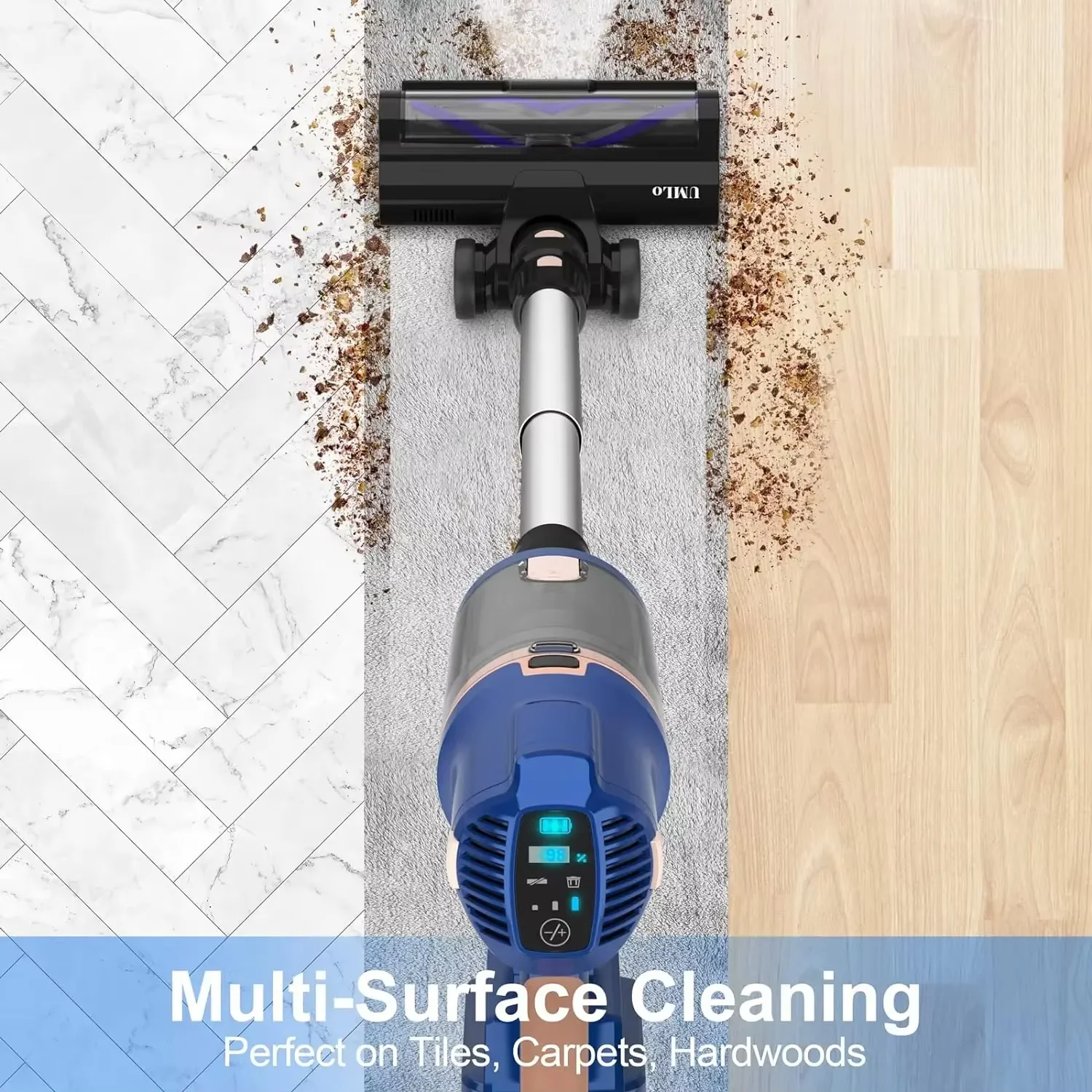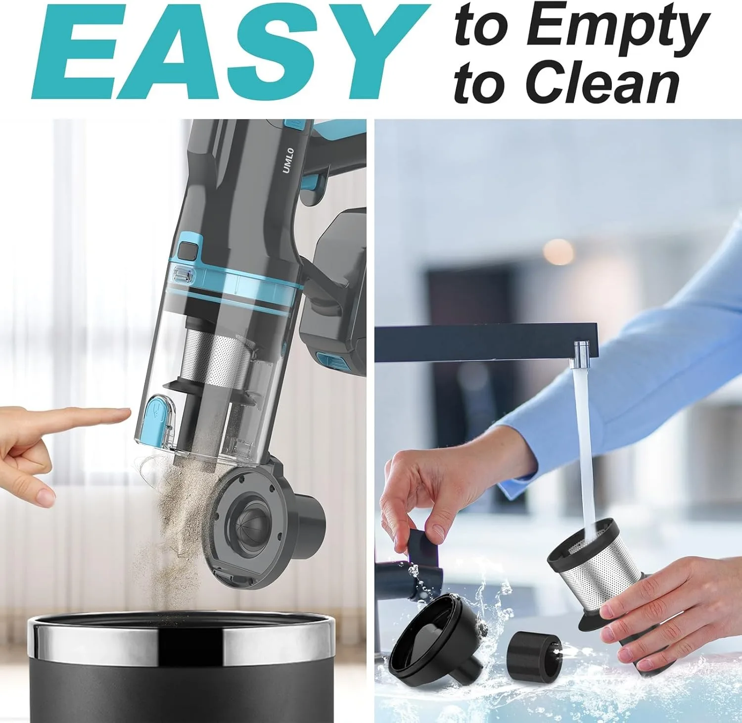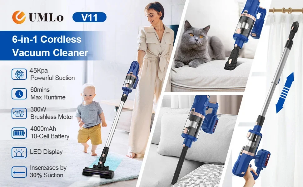 Specifications:Brand:UMLOModel:V11Type: Cordless Vacuum CleanerColor: Grey/Blue/RedVacuum Degree: 45000PaRated Power:300W Battery Capacity:4000 mAhOperating time : 60mins(Standard mode)/20mins(Max mode)Charging Time:5hProduct Weight:3.8KGPackage Size: 440 × 300 × 190 mm45Kpa Powerful Suction: The cordless vacuum cleaner equipped with a 300W upgraded brushless digital motor, generates 45KPA suction power force on max mode, easily picks up pet hair, debris from carpet, hardwood floor, tile, car, stair, sofa, etc. Brushless stick vacuum cordless provides better performance than a brushed vacuum cleaner.Smart Touch LED Display: The LED screen on the stick vacuum displays indicator, roller brush clog alert, filter clog alert, power mode indicator, and power mode switch, you can touch the switch to change power modes. The maneuverable motorized floor head features 5 LED lights, making the rechargeable vacuum easy to clean the dust under furniture or in hard-to-reach corners.Upgraded Filtration System: The cordless stick vacuum designed with 5 5-stage high-efficiency full sealed filtration system, captures large particles and 99.99% micro dust as small as 0.1um, expels ultimate purified air for your family, and prevents secondary air pollution. One button to quickly empty the 0.8L large dustbin, no need to touch the dirt. Increase 30% suction power: The motor, dustbin, and cyclone of the vacuum cordless are aligned, so air is drawn into the cyclones in a straight line – creating 30% more suction power than other vacuums. Enjoy the brand experience like dyxon at affordable prics.60 Mins Long Runtime: Breaking the conventional 6-7 cells, the rechargeable vacuum cordless is upgraded to 10 cell batteries, provides up to 60 mins runtime for deep cleaning in standard mode.The battery is rechargeable and detachable but can be charged only when connected to the main motor.