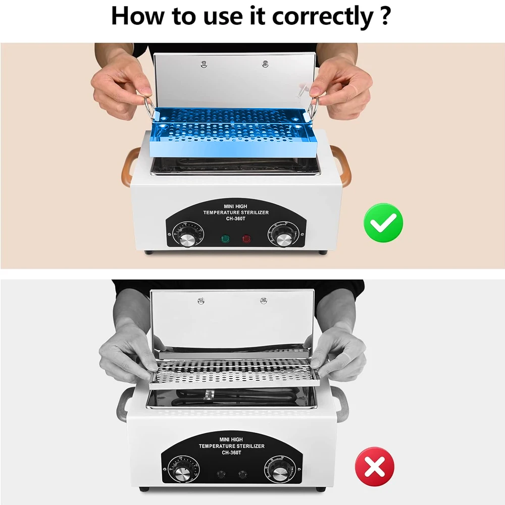 Product DescriptionName:CH-360TOutput voltage:AC220-240VPower:300WColor: WhitePacking Size:32*21*16cm/12.60*8.27*6.30inchFeatures:1.High temperature cleaning boxdry heat box designed for metal tools cleaning.Can remove hidden crevices that cleaning wipes can't reach,such as nail tweezers,scissors,towels,tableware and more.Nail tool sterilizer is the perfect assistant for beauty salon, barber shop, dental office or home use.2.Simple operation simple button operation,the interface is clear at a glance.Put your instrument to be sterilized on the tray and close the cover.Firstly,adjust the time dial,activating the device,then adjust the temperature dial.Both of the lights will go out when the device has finished its work.3.1.5l large capacity nail tool sterilizer has a large 1,500ml capacity,allows you to clean more things at once,saving time and power.The sterilizer box effectively cleans and sterilizes using only dry heating – no chemicals needed and no harmful rays involved in the sterilization process.4.Timing & temperature adjustmentthe cleaning box can be adjust the time dial according to your requirement from 0 to 60 minutes.Red indicator will light on.Temperature can be adjusted from 50°c to 220°c,the green indicator will light on.All instrument and goods can be totally sterilized in 15 minutes at 125 celsius degrees.5.Strong and sturdy the whole body of hot towel cabinet is made of high-quality stainless steel,rust proof;humanized handle is made of wood, soft touch;the bottom is equipped with a protective tripod, which can be placed stably anywhere.High temperature clean cabinet, cannot be cleaning plastic tools, only cleaning metal tools.